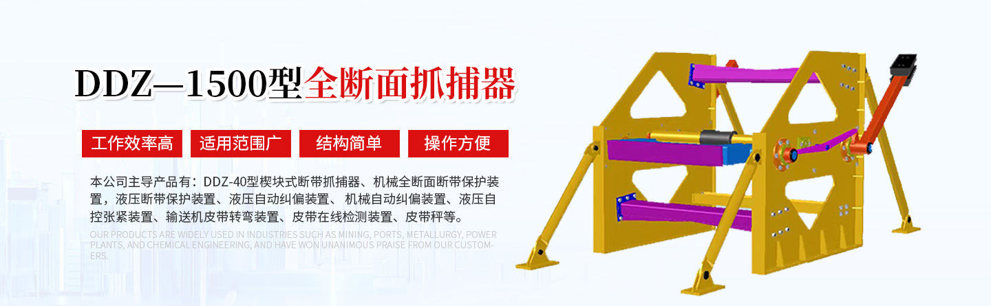 DDZ-40型楔塊式斷帶抓捕器、機械全斷面斷帶保護裝置,液壓斷帶保護裝置、液壓自動糾偏裝置、 機械自動糾偏裝置、液壓自控張緊裝置、輸送機皮帶轉彎裝置、皮帶在線檢測裝置、皮帶秤等。